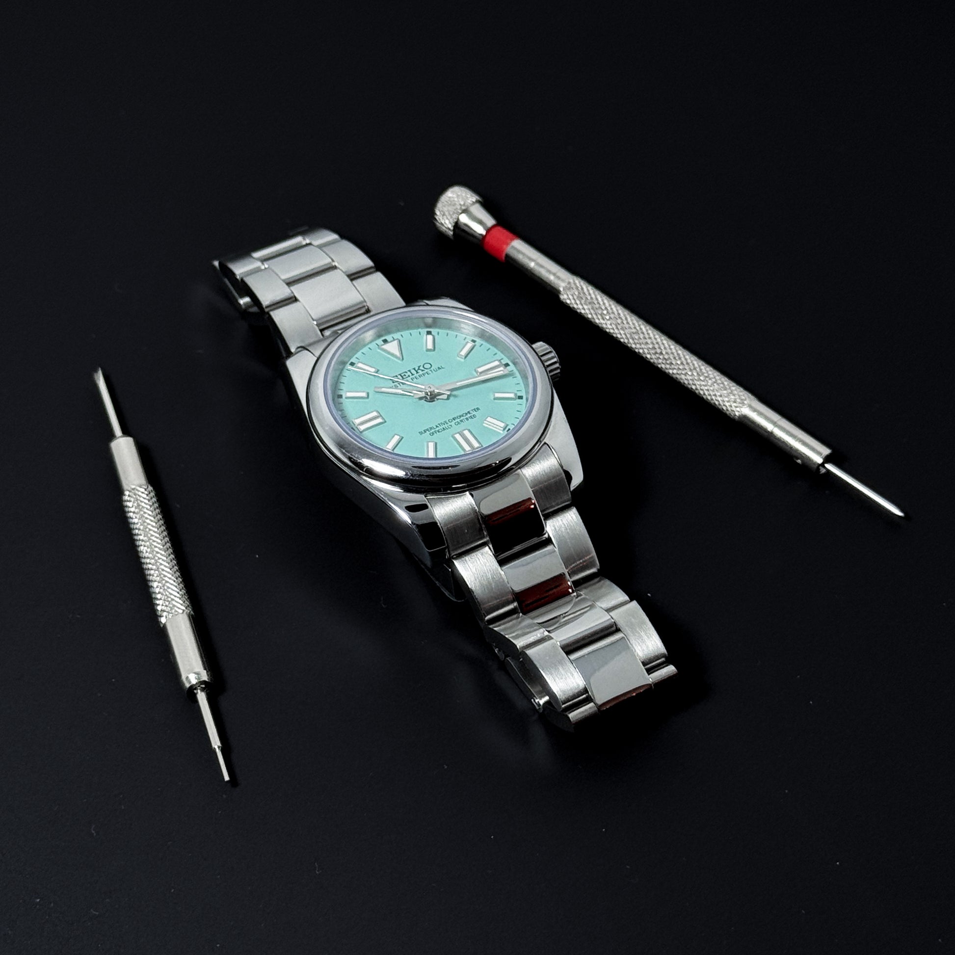 Introducing the OP TIFFANY, a custom Seiko NH35 Automatic Watch inspired by the iconic Oyster Perpetual design, meticulously crafted for those who seek elegance and precision. With a lead time of 3 weeks, this model features a solid tiffany aftermarket dial with lume markers and a transparent back piece, allowing a glimpse into the intricate automatic movement.